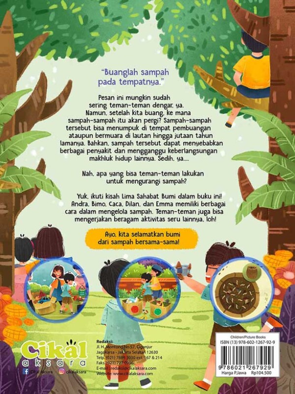 Yuk, ikuti kisah Lima Sahabat Bumi dalam buku ini! Andra, Bimo, Caca, Dilan, dan Emma memiliki berbagai cara dalam mengelola sampah. Teman-teman juga bisa mengerjakan beragam aktivitas seru lainnya, loh!