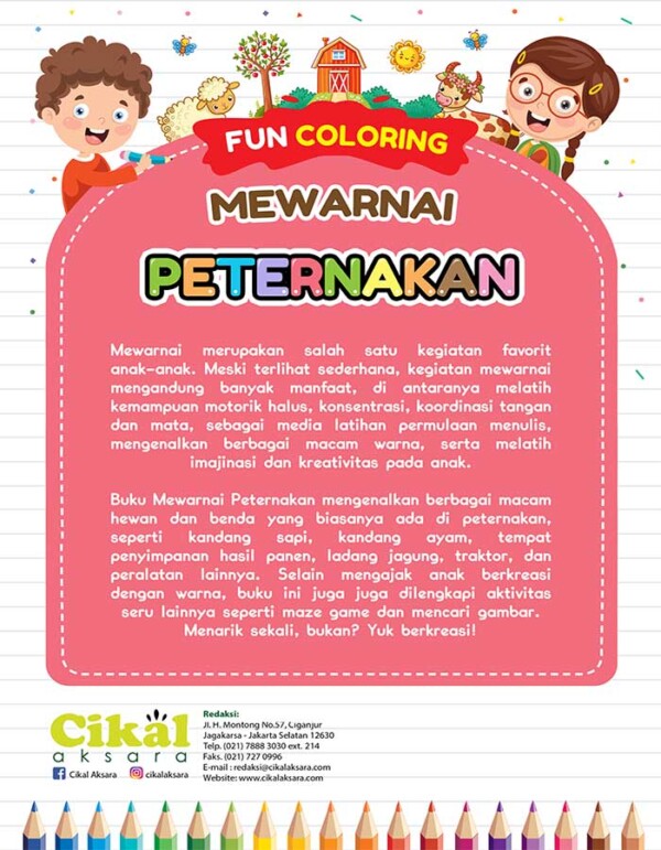 Buku Mewarnai Peternakan mengenalkan berbagai macam hewan dan benda yang biasanya ada di peternakan, seperti kandang sapi, kandang ayam, tempat penyimpanan hasil panen, ladang jagung, traktor, dan peralatan lainnya. Selain mengajak anak berkreasi dengan warna, buku ini juga juga dilengkapi aktivitas seru lainnya seperti maze game dan mencari gambar. Menarik sekali, bukan? Yuk berkreasi!