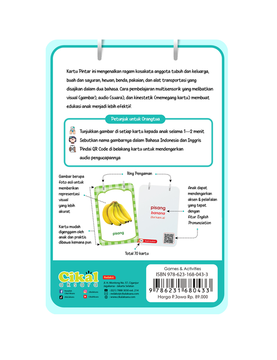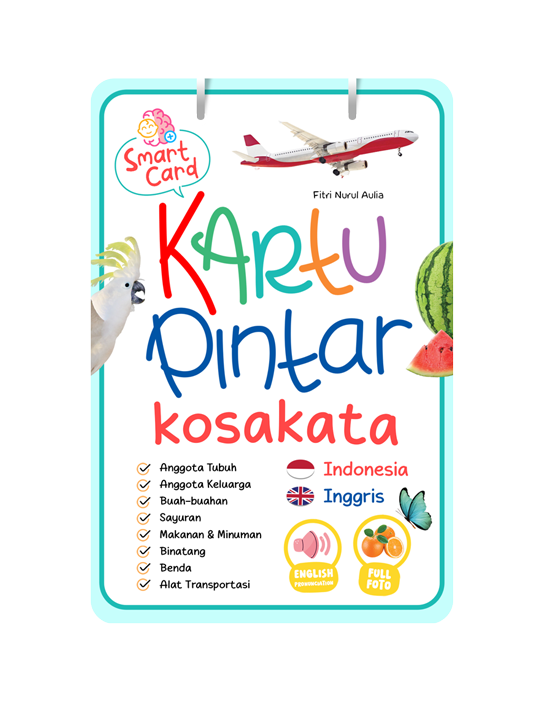 Kartu Pintar ini mengenalkan ragam kosakata anggota tubuh dan keluarga, buah dan sayuran, hewan, benda, pakaian, dan alat transportasi yang disajikan dalam dua bahasa. Cara pembelajaran multisensorik yang melibatkan visual (gambar), audio (suara), dan karakteristik (memegang kartu) membuat edukasi anak menjadi lebih efektif.